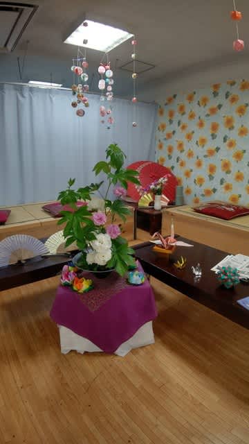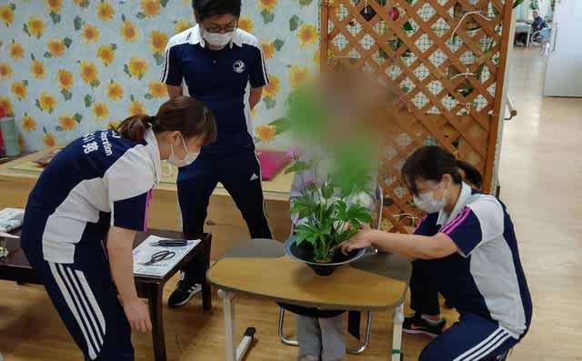 生けていただいたお花をセンターに飾ると他の利用者様もすぐに気づかれ、「あれよー、きれいな花いけちゃーるやん。」「やっぱりお花があると華やかな空間になってええね。」など、他にも男性利用者様からも含めてたくさんのリアクションをいただきました。