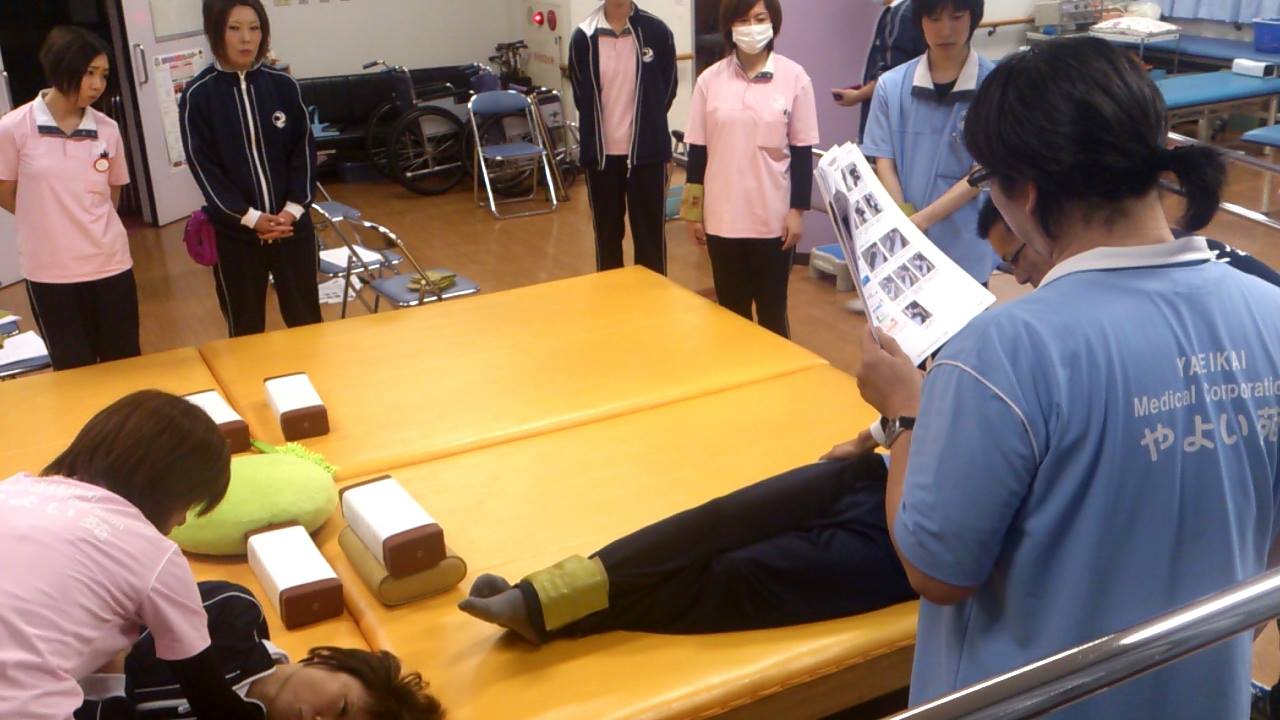 また、勉強会では移乗介助の技術のみでなく、どうして必要なのかという事を実例を元に説明し、参加者には疑似体験(介助される側・麻痺の方等)もしてもらい勉強会を終えました。