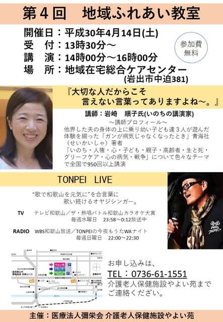平成30年4月14日(土)午後14時より、【第4回 地域ふれあい教室】を開催いたします。