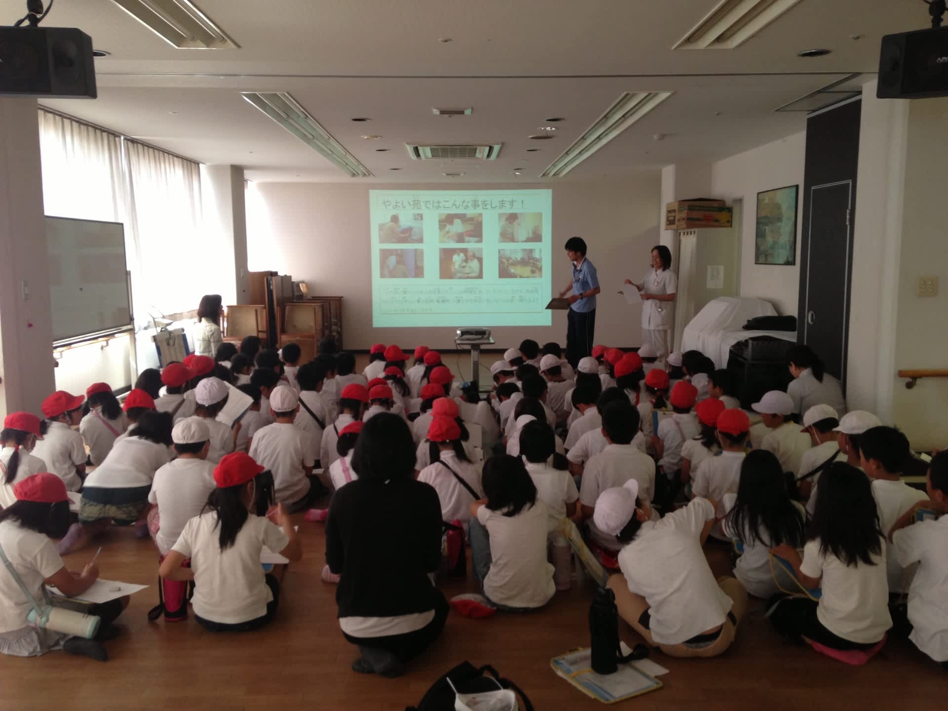 平成25年5月15日(水)当施設やよい苑において、岩出中央小学校第3学年の生徒90名が総合的な学習の時間「地域をよく知り、ふるさとを知ろう」という事でやよい苑の施設見学に来られました。