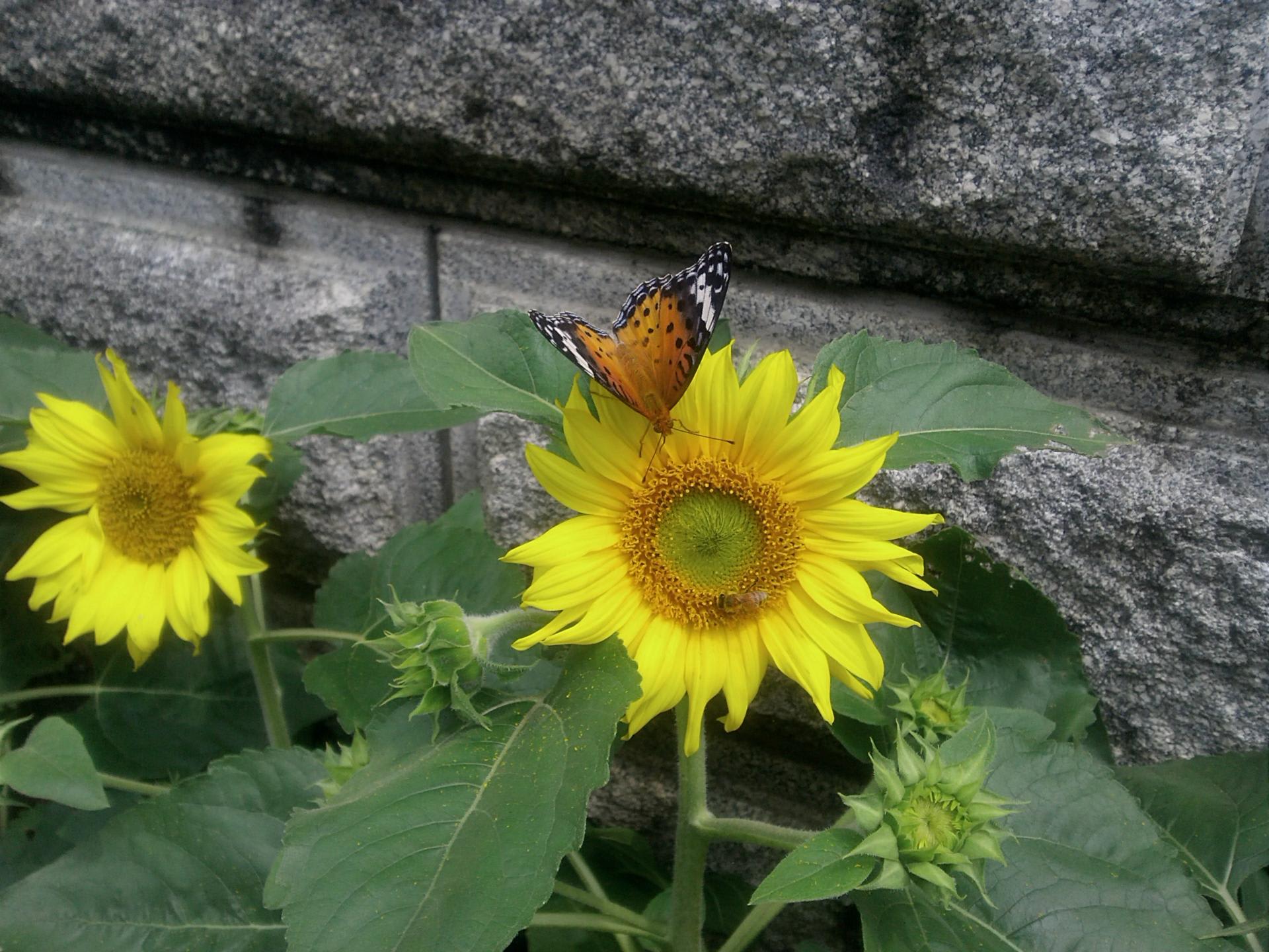 写真にもありますように、立派に咲いている向日葵に蝶と蜂が花の蜜を集めに来ていました。