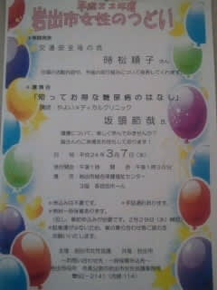 本日、平成24年3月7日(水)、午後1時30分より岩出市総合保健福祉センター3階 多目的ホールにて「平成23年度 岩出市女性のつどい」が開催されます。
