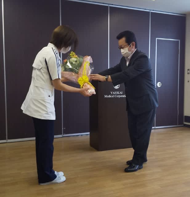今回は苑内での表彰式であった為、黒山理事長・和田本部長・坂頭院長から、お心のこもったお言葉を直々に頂戴出来て、大変感激致しました。ありがとうございました。