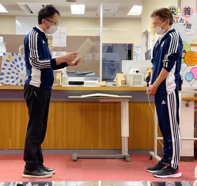 永年にわたり業務に従事し、地域の医療と介護の発展に貢献した業績が認められ、リハビリテーション課の岸岡課長が、那賀医師会医療従事者永年勤続表彰を受賞され、令和3年6月18日(金)に苑内で表彰式を執り行いました。