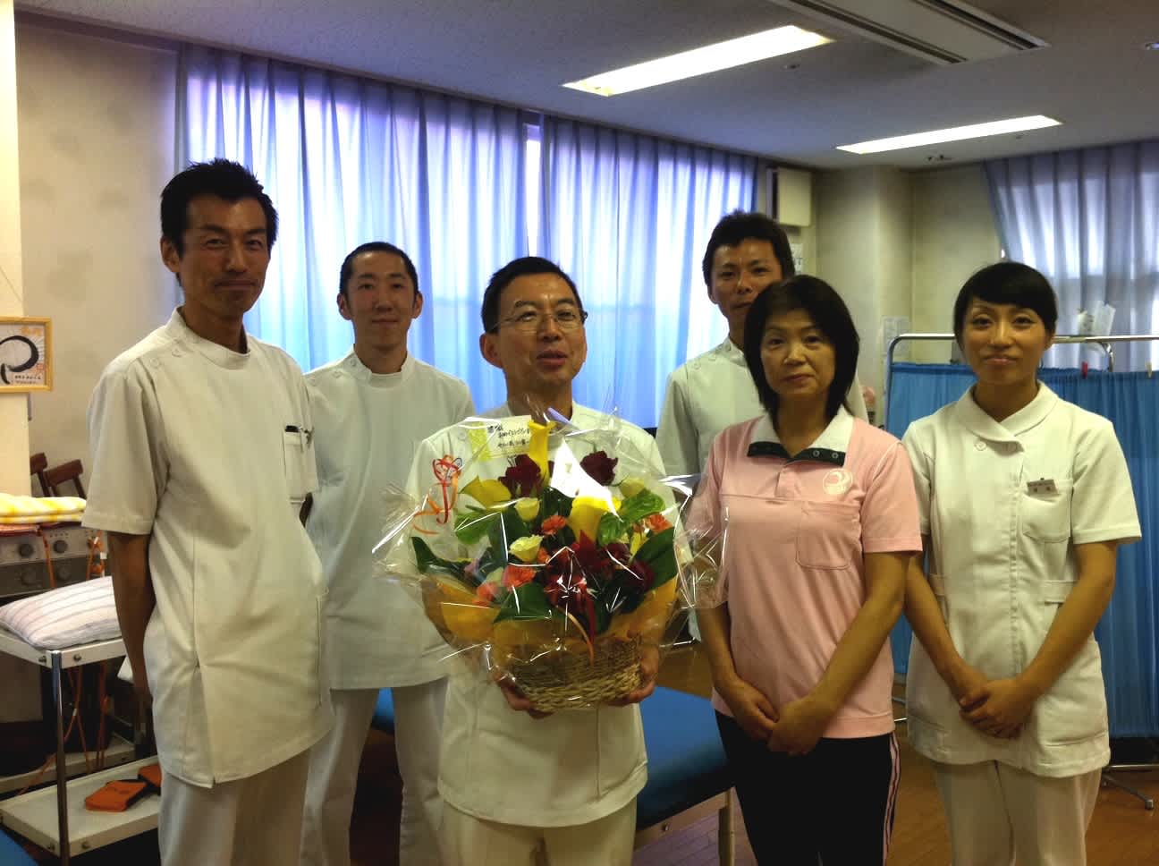 写真に写っております花束を持っている職員の熊さんこと熊代正雄針灸師です。