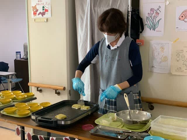 今回は出勤している職員のみんなが、楽しんでもらおうと「焼くところから見てみて!」とホットプレートの前に入所者様を呼び寄せてくれました。