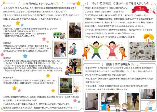 平成31年4月の初回発行から早くも1年が過ぎ、今月の4月号で「やよい苑広報誌 なぎ」が一周年を迎えました!!